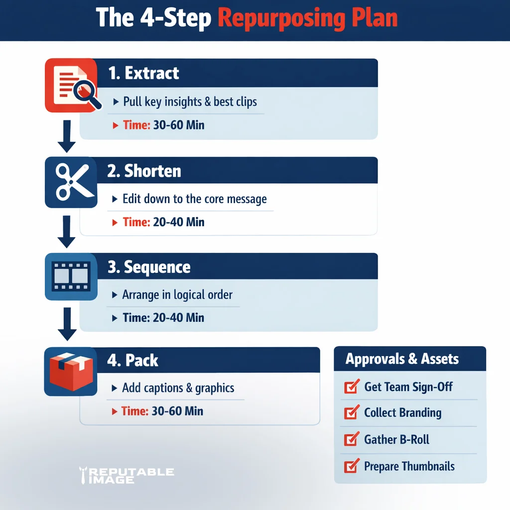 A practical 4-step plan keeps repurposing focused: (1) Extract — pull the core thesis and 6–10 micro points, (2) Shorten — write punchy social captions and headlines, (3) Sequence — arrange points into an email drip or carousel order, and (4) Pack — assemble a PDF with expanded examples and downloadable templates. This plan keeps teams aligned and makes repurposing predictable week-to-week.