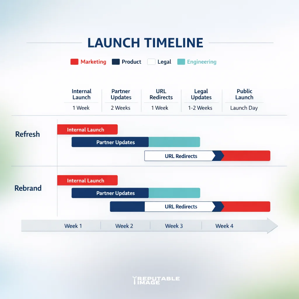 Refresh projects can be budgeted as marketing initiatives (weeks to 3 months, modest design/asset costs). Rebrands are multi-discipline projects often requiring 6–12+ months with legal, product, and engineering costs included. Always pad timelines for stakeholder review and technical migration; rushed rebrands are where details break.